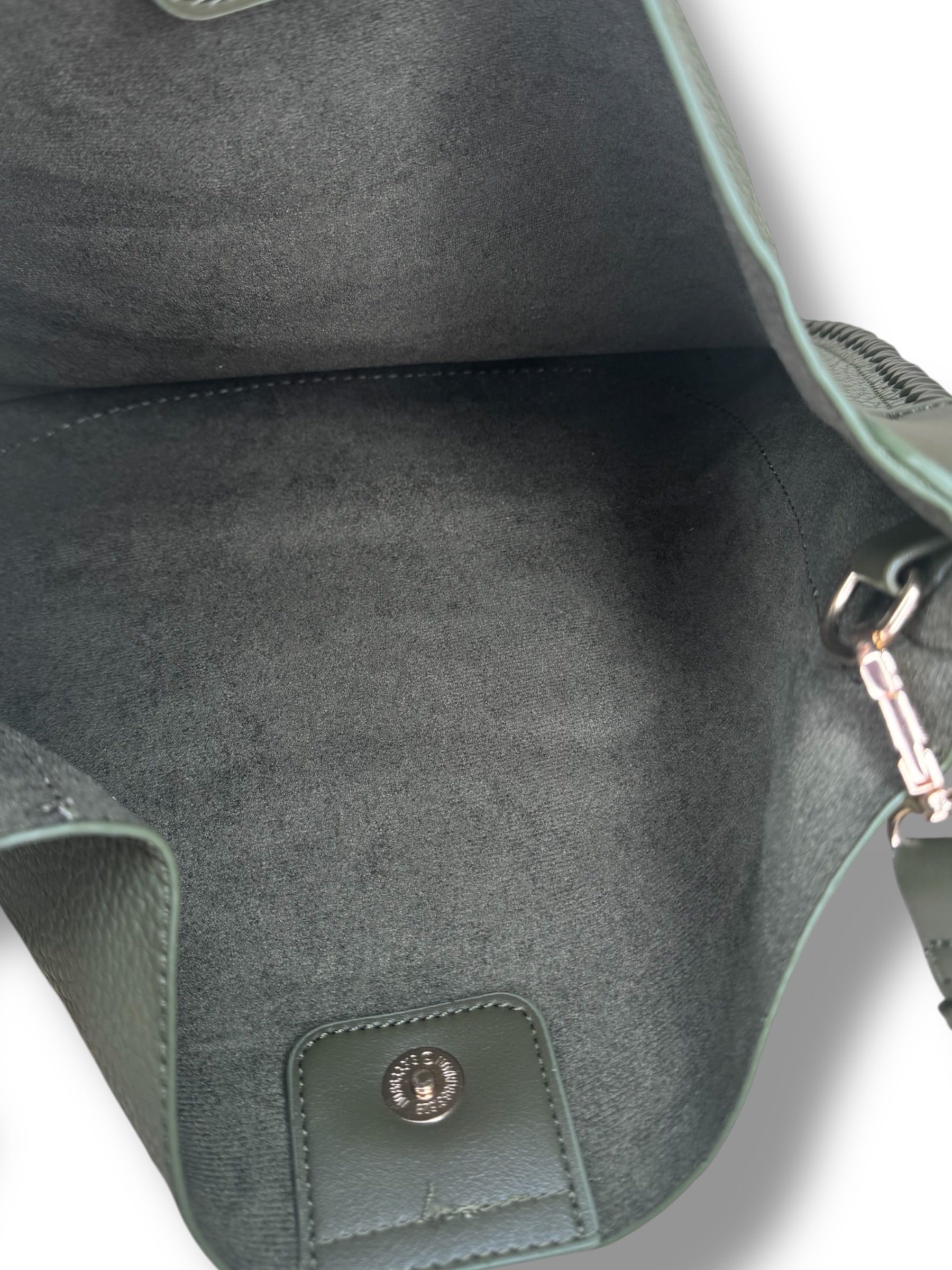 La borsa Teddy realizzata in similpelle martellata, che le conferisce un aspetto raffinato e una texture piacevole al tatto. La chiusura è dotata di un bottone magnetico, che assicura la sicurezza degli oggetti contenuti.