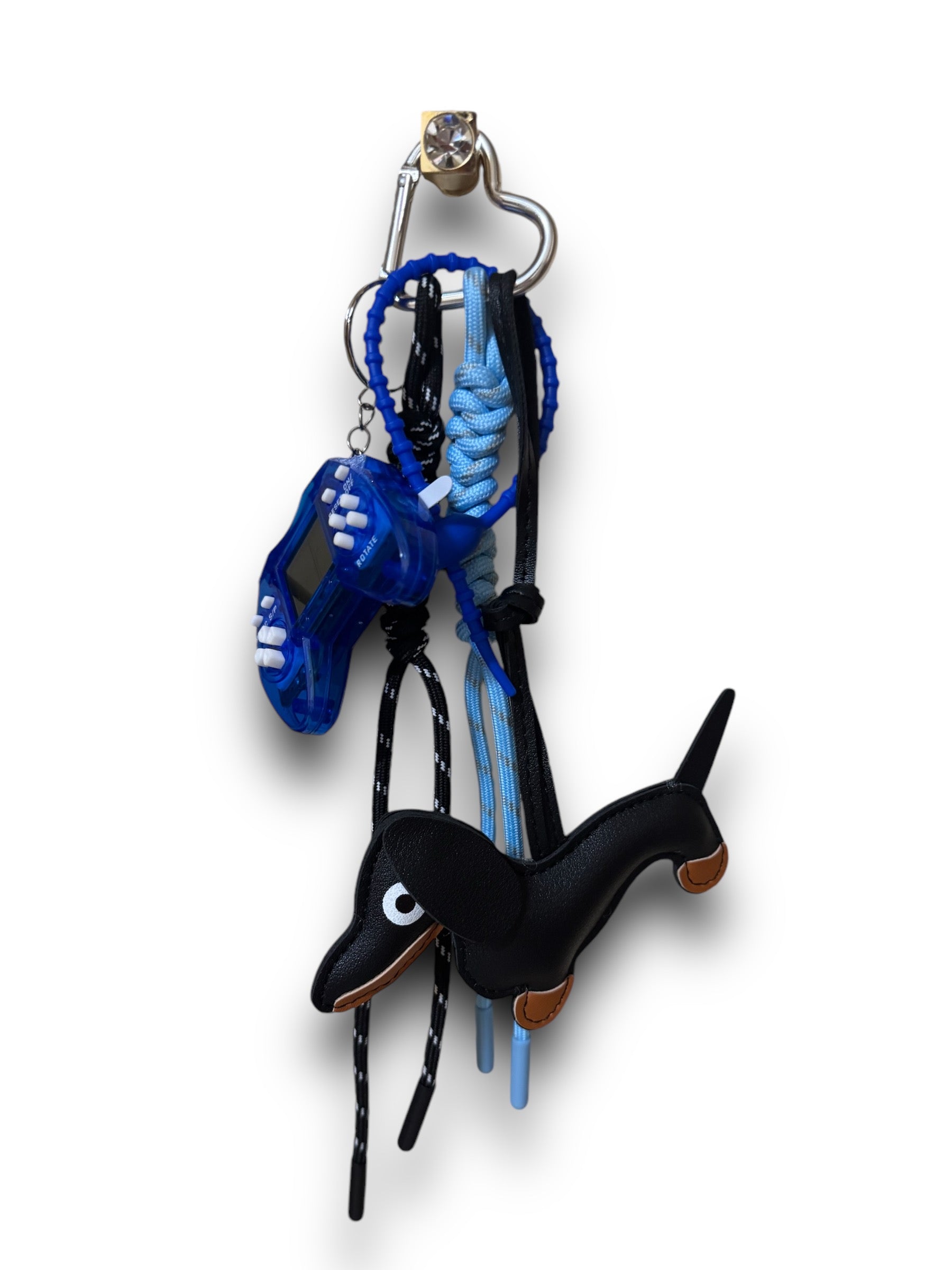 Charm composto da: cane bassotto nero, joystick blu e catena