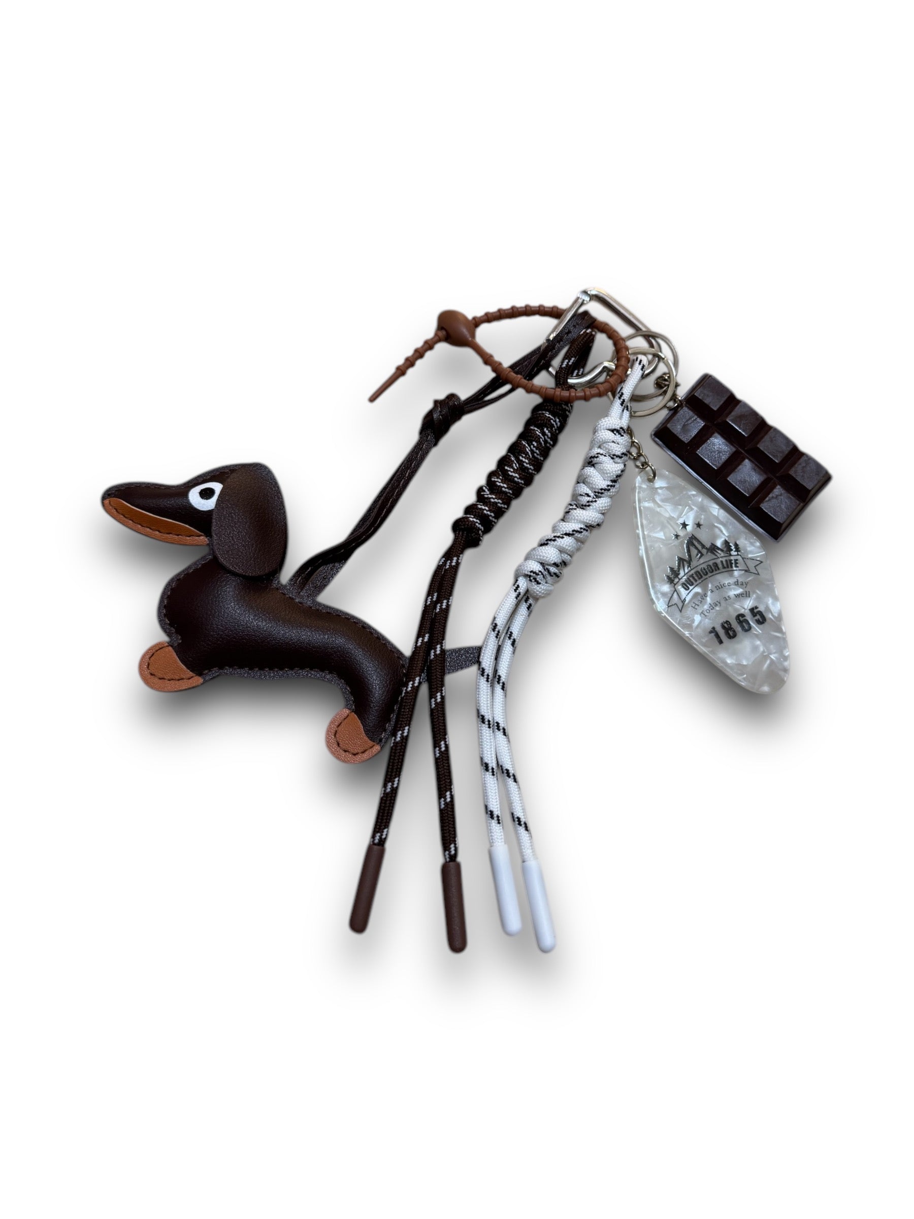 Charms composta da:bassotto,pezzo di cioccolato e corde.