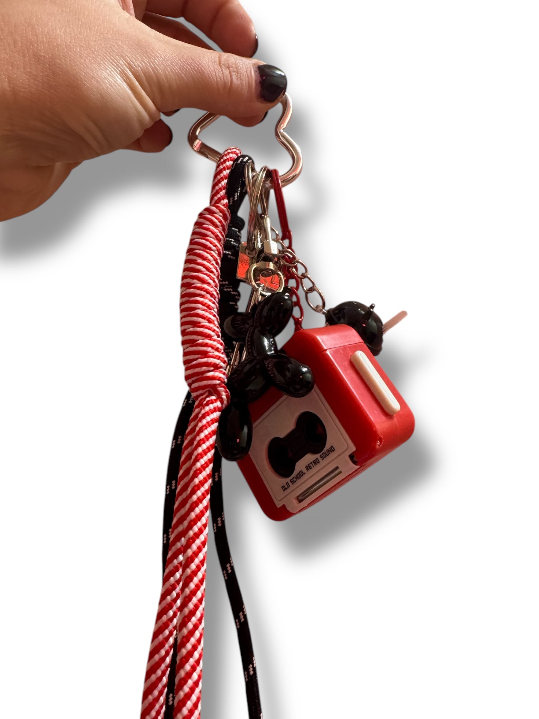 Charms composto da: radio funzionate rossa,chiave cognolino nero e due corde.