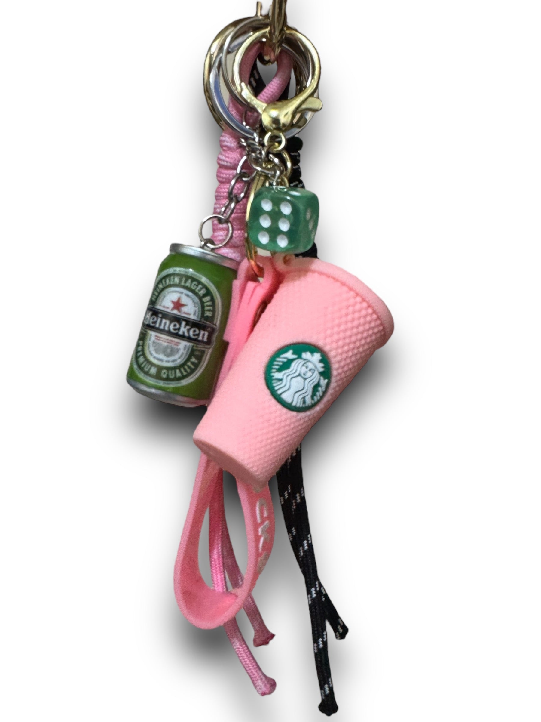 Charms composto da: bicchiere Sturbacks rosa,lattina heineken,dadi rosa e corde.