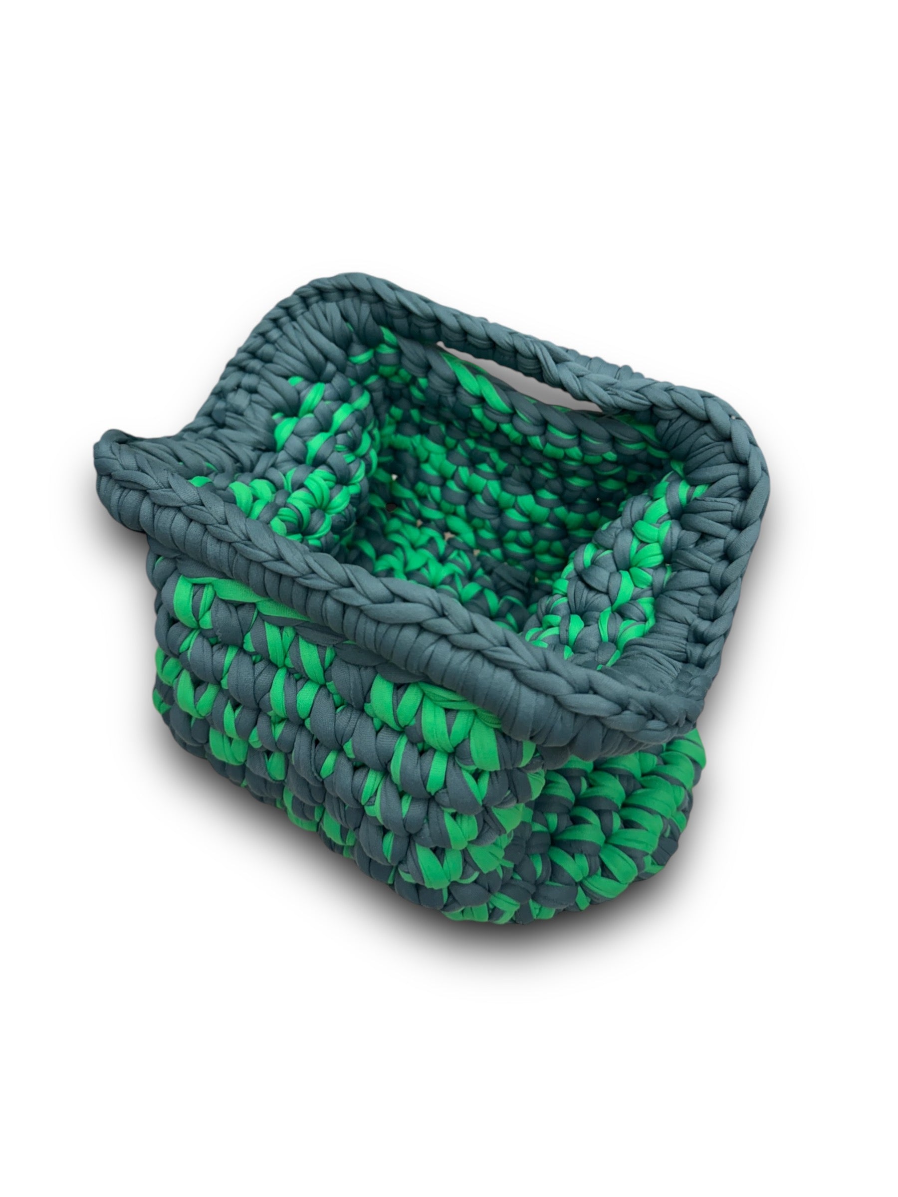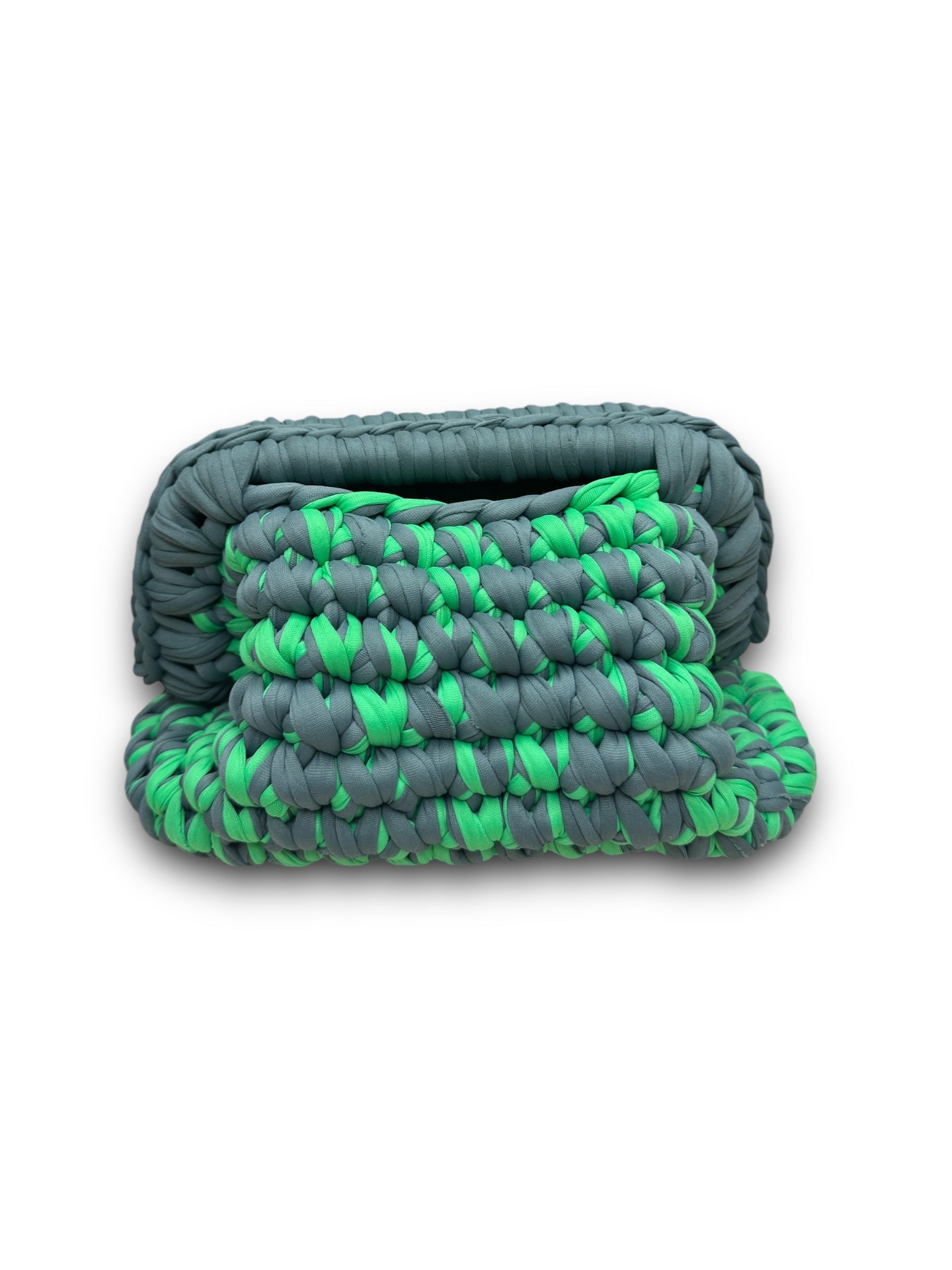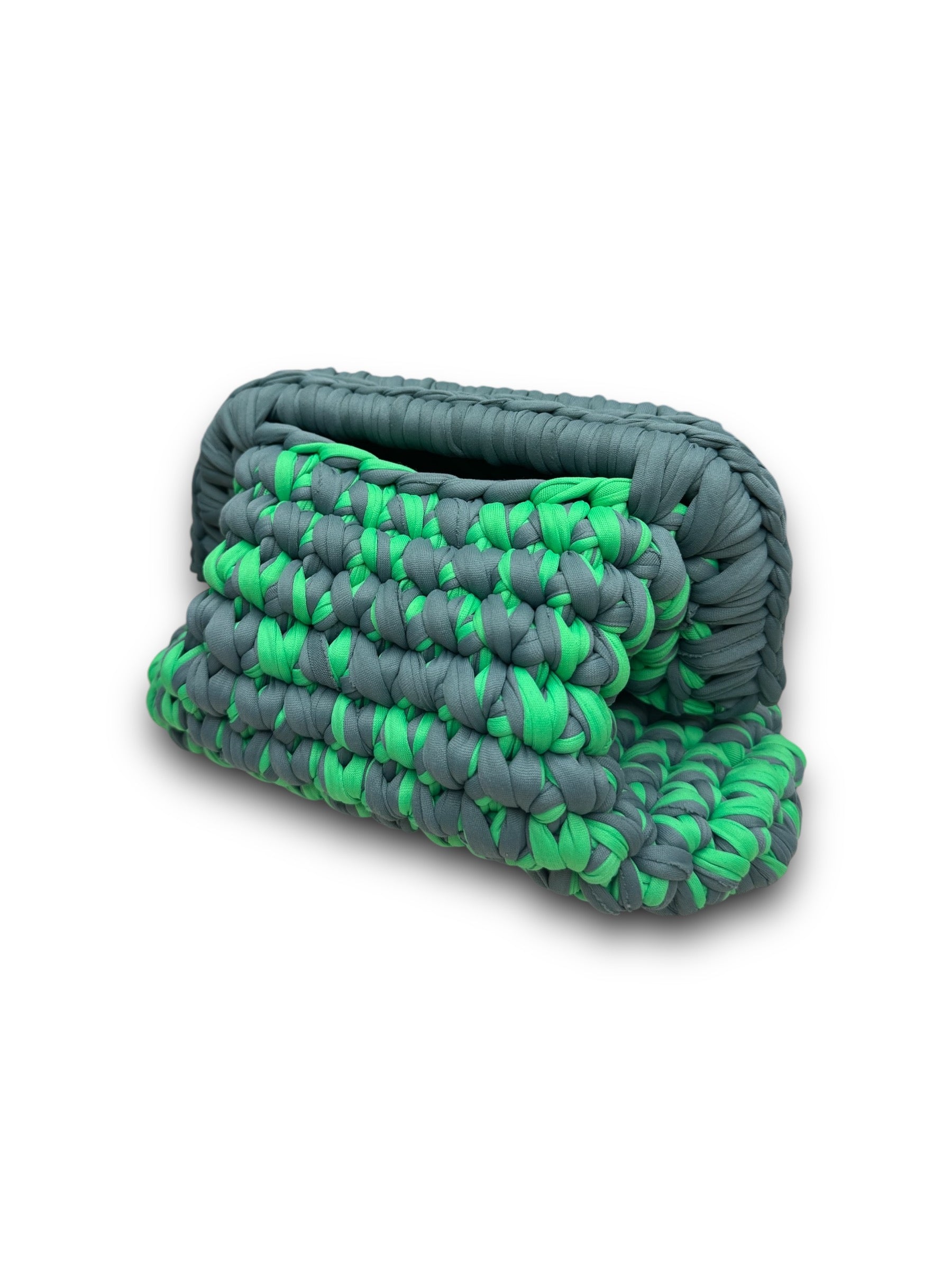 Pochette realizzata a mano con fettuccia in licra e chiusura rettangolare a scatto.