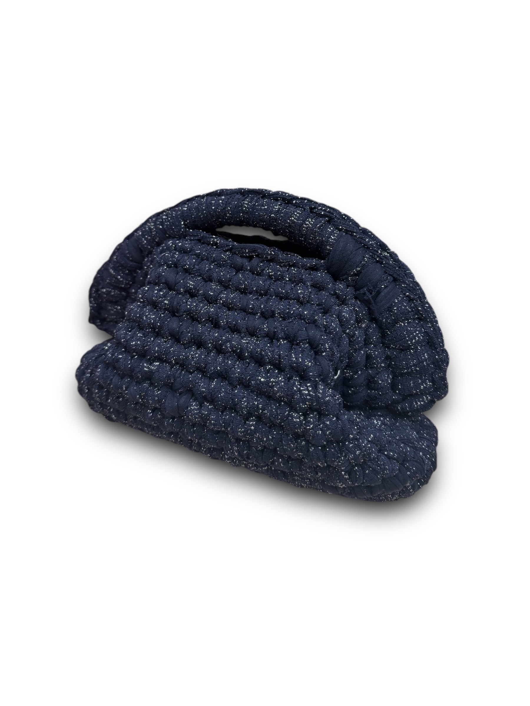 Pochette realizzata a mano con fettuccia in licra e chiusura ovale a scatto.