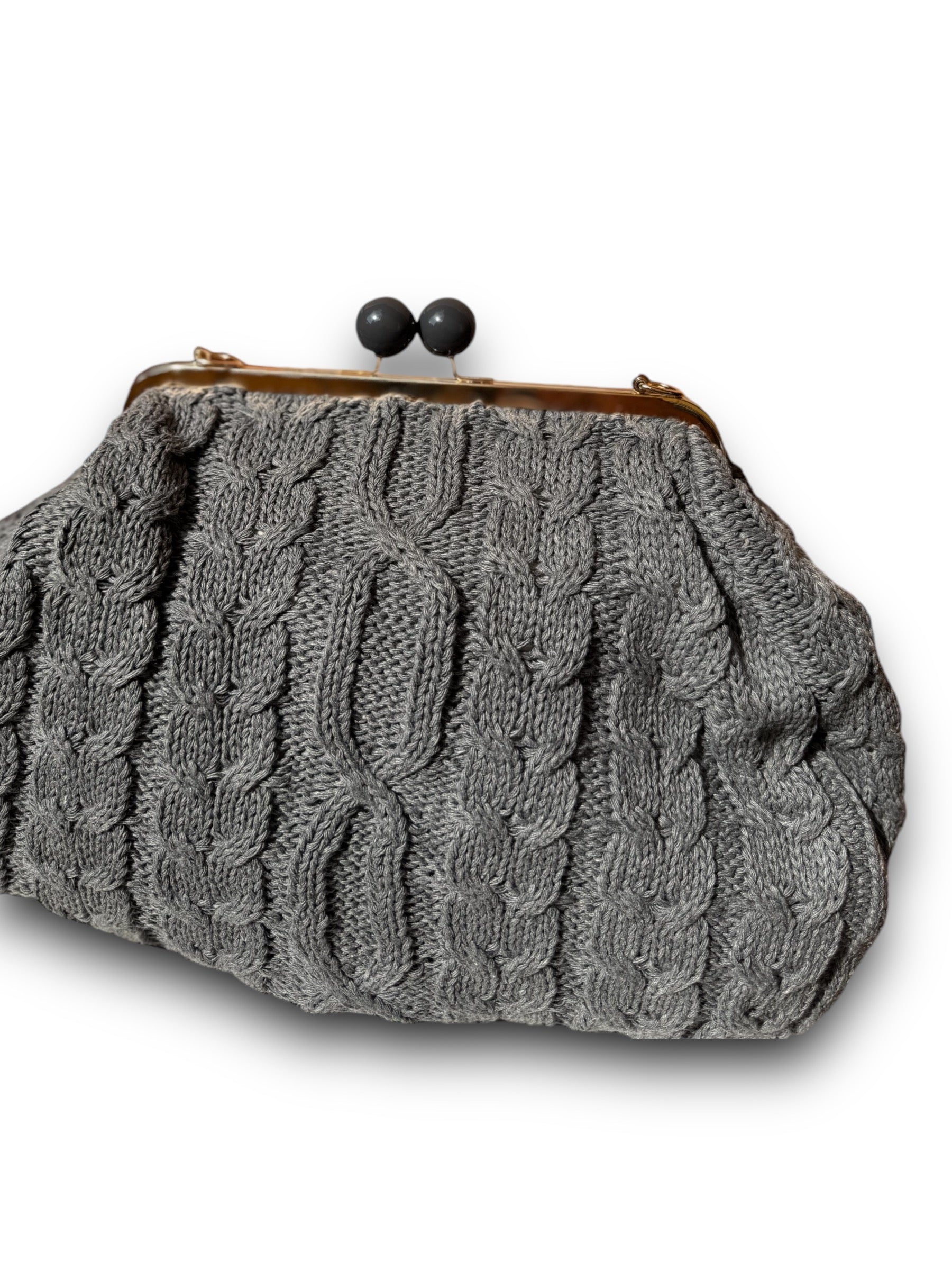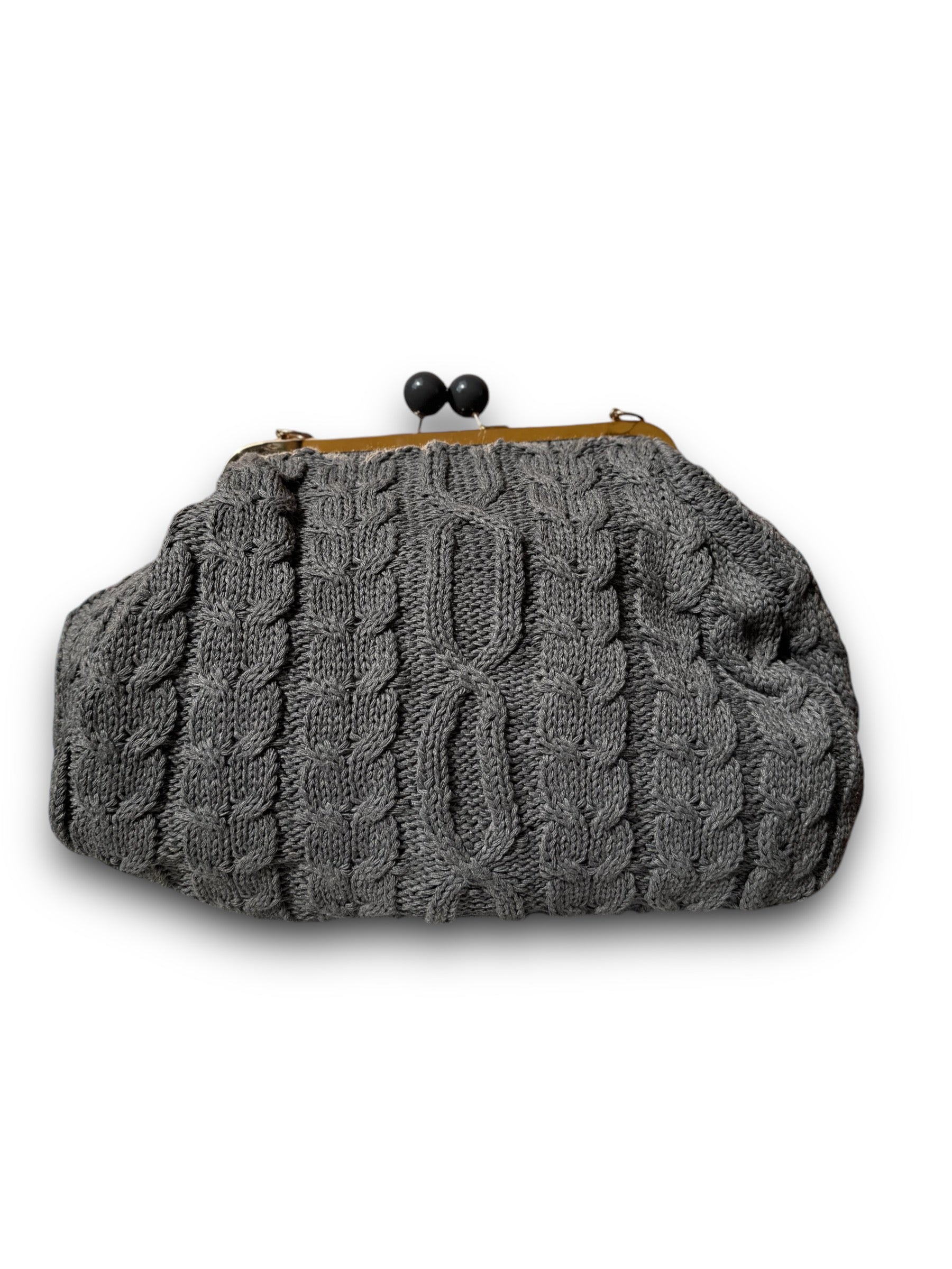 Clutch in lana con motivo a trecce dotata di tracolla a catena oro, con chiusura a scatto. Con la sua forma destrutturata e le sue proporzioni volutamente over si adatta ad ogni tua esigenza.