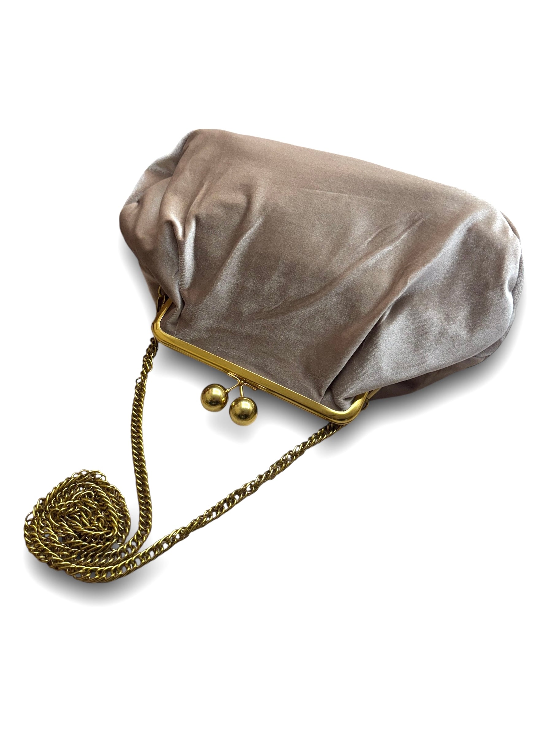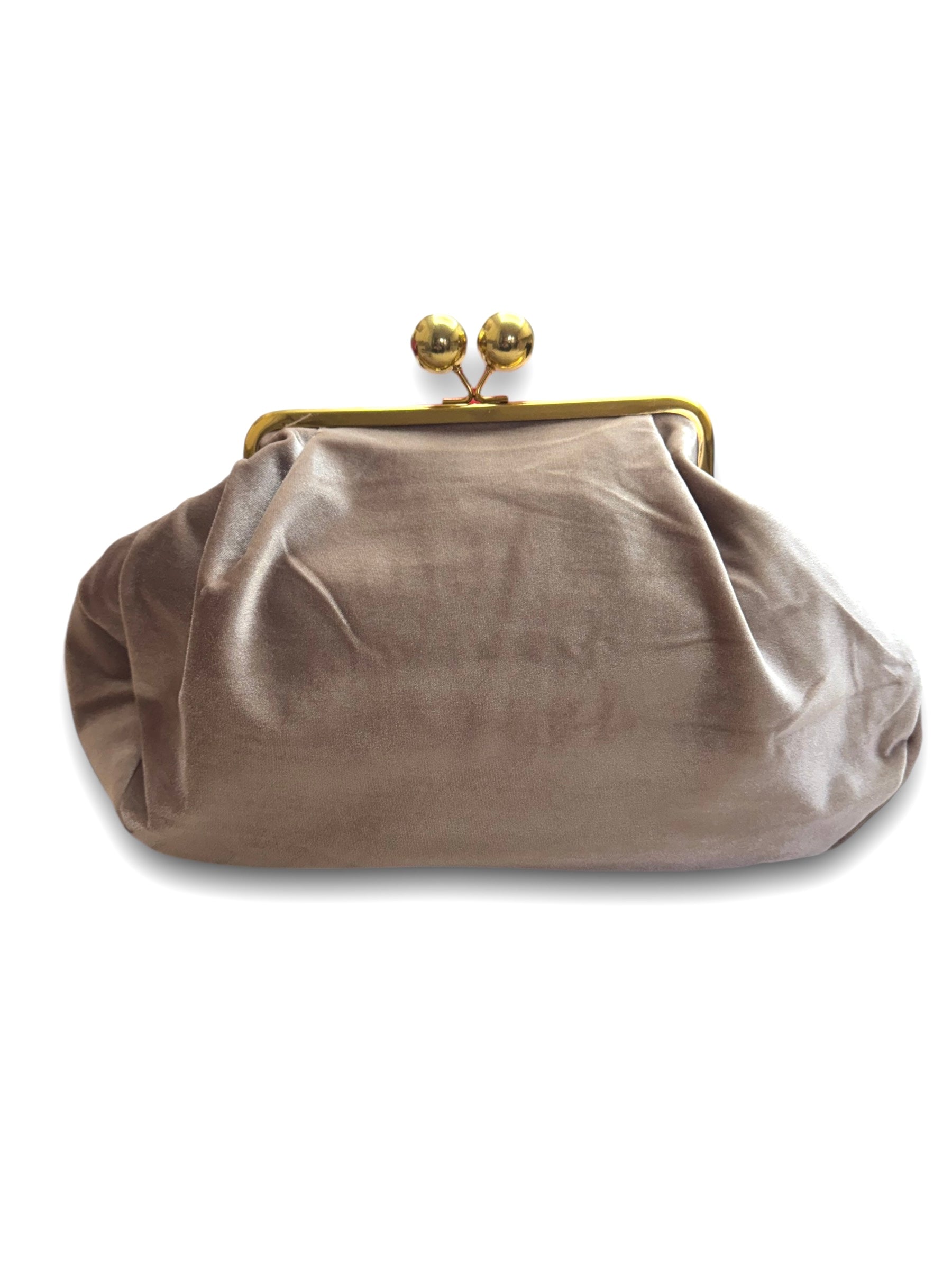 Cluch a mano in velluto e chiusura a scatto. La borsa è dotata di una tracolla oro removibile. Perfetta per aggiungere un tocco di originalità ed eleganza a qualsiasi outfit, questa borsa è ideale per chi desidera un accessorio unico e accattivante.
